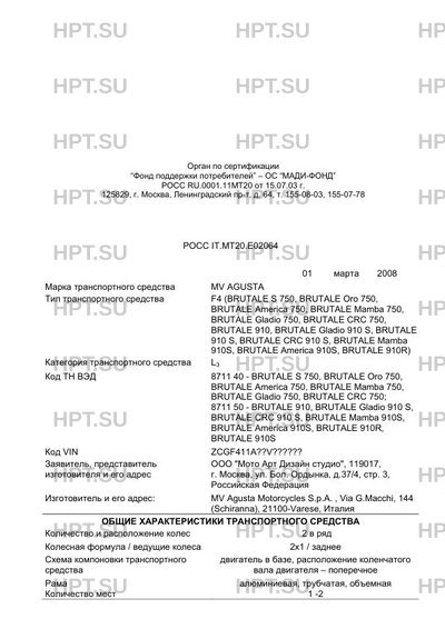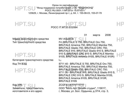 | Тип ТС | F4 (BRUTALE S 750, BRUTALE Oro 750, BRUTALE America 750, BRUTALE Mamba 750, BRUTALE Gladio 750, BRUTALE CRC 750, BRUTALE 910, BRUTALE Gladio 910 S, BRUTALE 910 S, BRUTALE CRC 910 S, BRUTALE Mamba 910S, BRUTALE America 910S, BRUTALE 910R) |