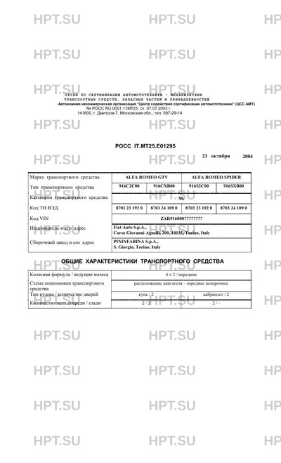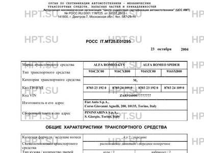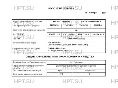 | Марка ТС | ALFA ROMEO GTV ALFA ROMEO SPIDER |