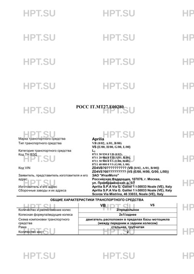 | Сборочный завод | и их адреса Aprilia S.P.A Via G. Galilei 1 I-30033 Noale (VE), Italy Scorze Via Mistrina, 46 33033, Noale (VE), Italy |