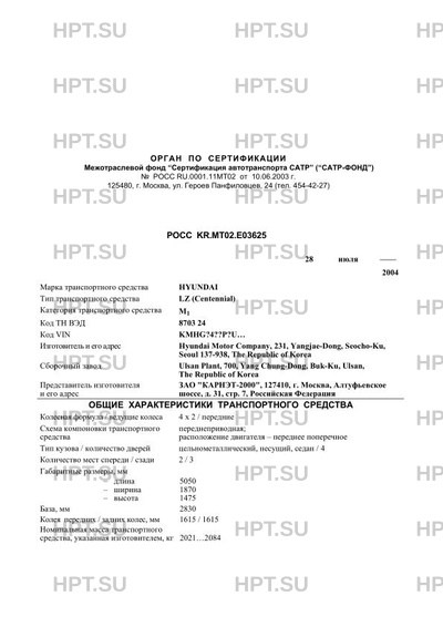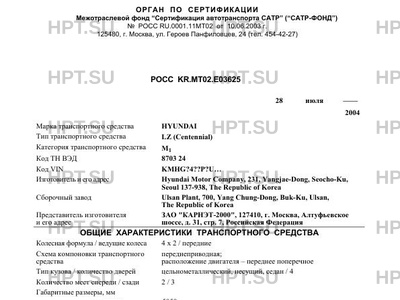 | Предприятие-изготовитель | Hyundai Motor Company, 231, Yangjae-Dong, Seocho-Ku, Seoul 137-938, The Republic of Korea Ulsan Plant, 700, Yang Chung-Dong, Buk-Ku, Ulsan, The Republic of Korea |