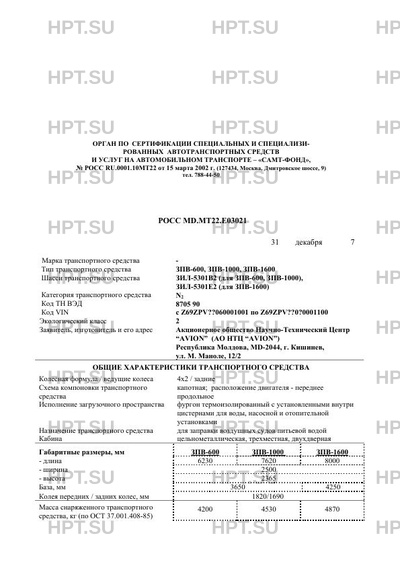 | Коммерческое наименование | Спецмашина для заправки питьевой водой воздушных судов типа ЗПВ-600, ЗПВ-1000, … |