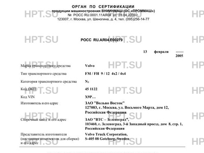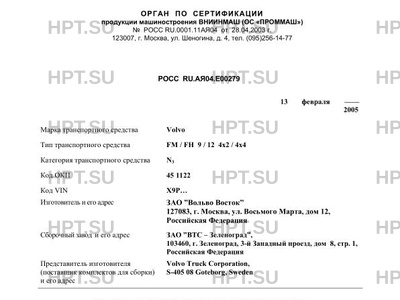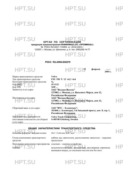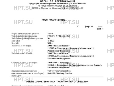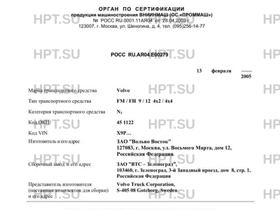 Сборочный завод ЗАО "ВТС - Зеленоград", 103460, г. Зеленоград, 3-й Западный проезд, дом 8, стр. 1, Российская Федерация Представитель изготовителя (поставщик комплектов для сборки) и его адрес Volvo Truck Corporation, S-405 08 Gоteborg, Sweden