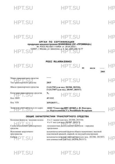 | Тип ТС | 2815, Шасси транспортного средства: ГАЗ-2705 (для мод. 281500, 281510), ГАЗ-27057 (для мод. 281507, 281517) |