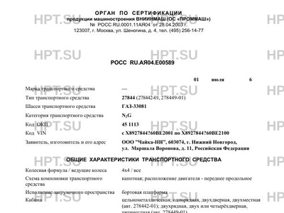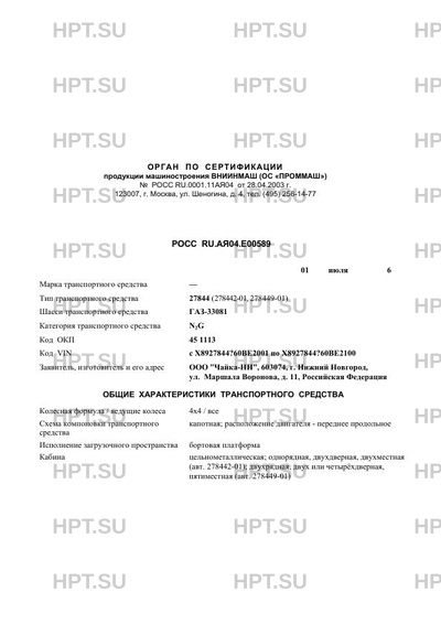 | Коммерческое наименование | 27844 (278442-01, 278449-01); Шасси транспортного средства: ГАЗ-33081; Категори… |