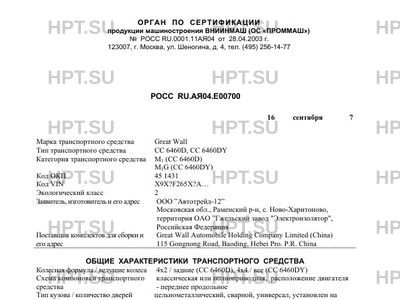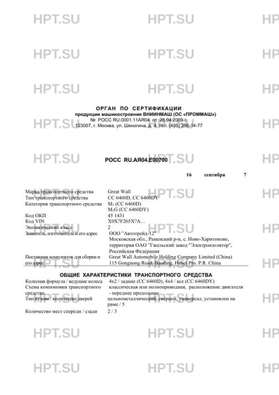 Поставщик сборочных комплектов и его адрес Great Wall Automobile Holding Company Limited (China) 115 Gongnong Road, Baoding, Hebei Pro. P.R. China