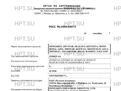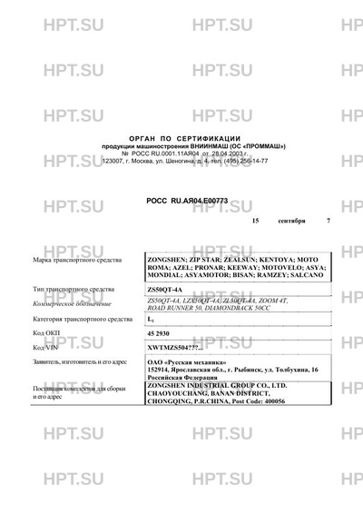 | Марка ТС | ZONGSHEN; ZIP STAR; ZEALSUN; KENTOYA; MOTO ROMA; AZEL; PRONAR; KEEWAY; MOTOVELO; ASYA; MONDIAL; ASYAMOTOR; BISAN; RAMZEY; SALCANO |