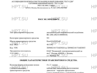 | Тип ТС | автомобильный гидравлический подъемник ВС-28К (48214-0000010) на КамАЗ-43253-02 |