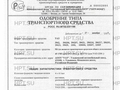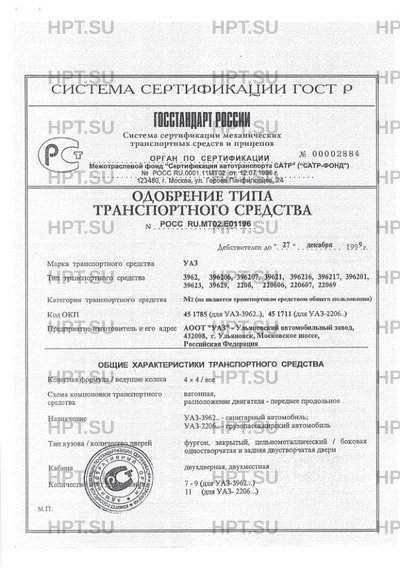 | Оборудование ТС | Стеклоочиститель, стеклоомыватель ветрового стекла; наружные зеркала заднего вида, отопитель, электрический звуковой сигнал: для УАЗ-3962-кронштейны и подвесные ремни крепления носилок |