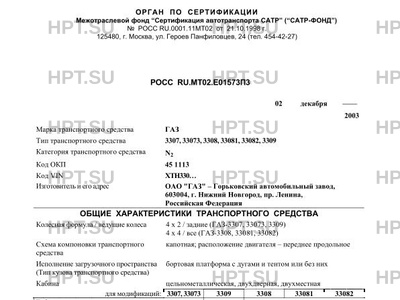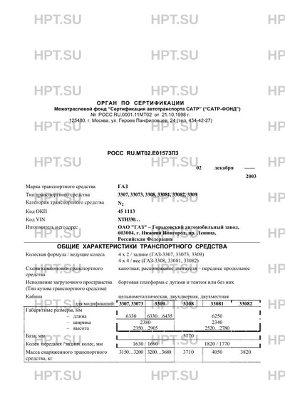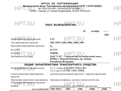 | Оборудование ТС | независимый отопитель; мод. ГАЗ-3308, 33081, 33082 могут быть оборудованы коробкой отбора мощности автомобиль грузовой ГАЗ 3307, 33073, 3308, 33081, 33082, 3309 |