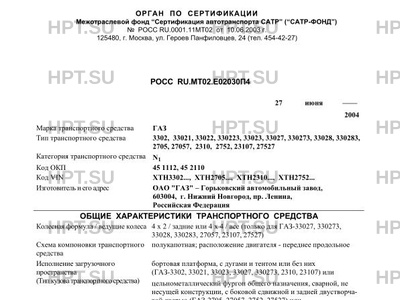 | Оборудование ТС | вентиляционный люк в крыше, дополнительный отопитель, утеплитель облицовки радиатора, по заказу для автомобилей с колесной формулой 4 х 4 - защита оперения автомобиль грузовой ГАЗ 3302, 33021, 33022, 330223, 33023, 33027, 330273, 33028, 330283, 2705, 27057, 2310, 2752, 23107, 27527 |