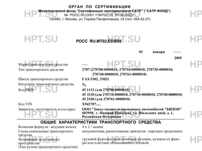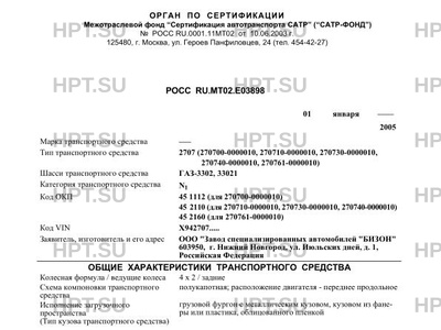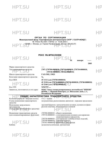 | Назначение | транспортных средств (для специализированных фургонов) 270700-0000010 - общего назначения, 270710-0000010 - с изотермическим кузовом для перевозки скоропортящихся продуктов, 270730-0000010 - для перевозки хлебобулочных изделий, 270740-0000010 - торговый фургон, 270761-0000010 - автомобиль-мастерская |