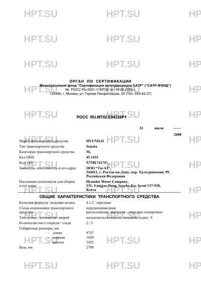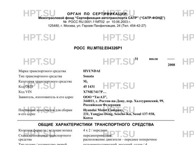 | Поставщик сборочных комплектов | и его адрес Hyundai Motor Company, 231, Yangjae-Dong, Seocho-Ku, Seoul 137-938, Korea |