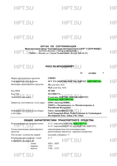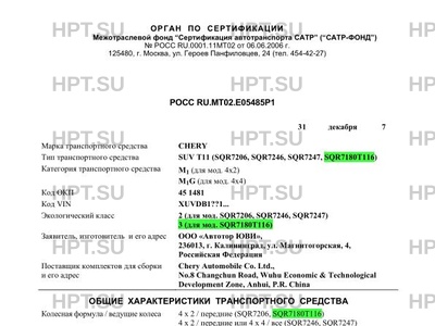 Коммерческое наименование SUV T11 (SQR7206, SQR7246, SQR7247, SQR7180T116)
