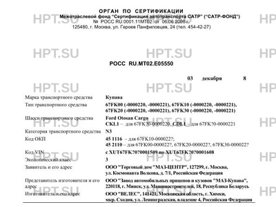 | Базовое ТС / Шасси | Ford Otosan Cargo CKL1 - для 67FK?0-0000220, CDL1 - для 67FK?0-0000221 |