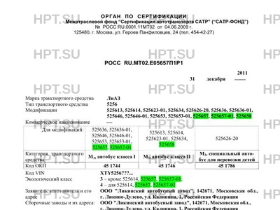 Сборочный завод и их адреса: ООО "Ликинский автобусный завод", 142671, Московская обл., г. Ликино-Дулево, ул. Калинина, 1, Российская Федерация ОАО "Голицынский автобусный завод", 143050, Московская обл., Одинцовский район, п/о Большие Вяземы, д. Малые Вяземы, д. 1, Российская Федерация (для транспортных средств класса II) ООО "Д.В.С. - ЭКО", 109559, г. Москва, ул. Краснодарская, д. 60, Российская Федерация (в части установки газобаллонного оборудования на мод. 525657, 525657-01)