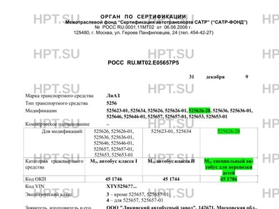 | Сборочный завод | и их адреса: ООО "Ликинский автобусный завод", 142671, Московская обл., г. Ликино-Дулево, ул. Калинина, 1, Российская Федерация (для транспортных средств класса I, II и 525626-20) ОАО "Голицынский автобусный завод", 143050, Московская обл., Одинцовский район, п/о Большие Вяземы, д. Малые Вяземы, д. 1, Российская Федерация (для транспортных средств класса II) ООО "Д.В.С. - ЭКО", 109559, г. Москва, ул. Краснодарская, д. 60, офис 153, Российская Федерация (для модификаций 525657, 525657-01) 2 |