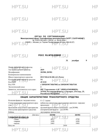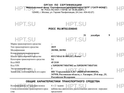 | Базовое ТС / Шасси | HYUNDAI H-100 (AU) Porter |