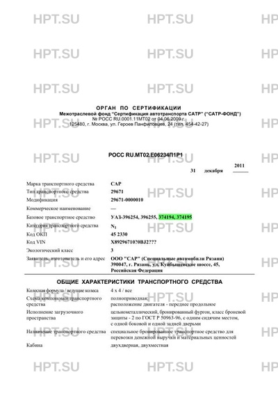 | Базовое ТС / Шасси | УАЗ-396254, 396255, 374194, 374195 |