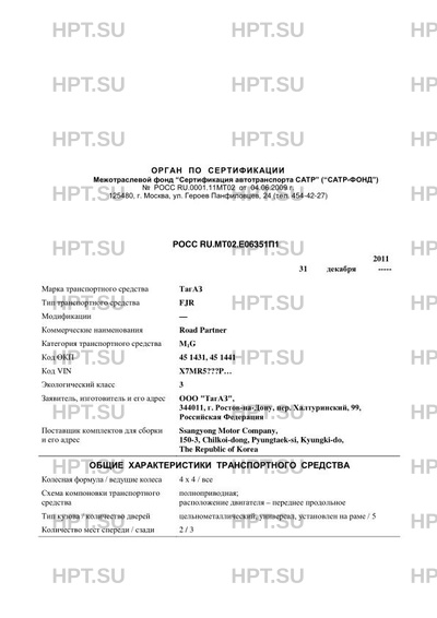 Поставщик сборочных комплектов и его адрес Ssangyong Motor Company, 150-3, Chilkoi-dong, Pyungtaek-si, Kyungki-do, The Republic of Korea