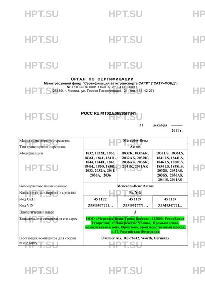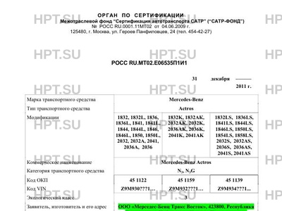 | Тип ТС | Actros (1832, 1832L, 1836, 1836L, 1841, 1841L, 1844, 1844L, 1846, 1846L, 1850, 1850L, 2032, 2032A, 2041, 2036A, 2036), (1832K, 1832АК, 2032AK, 2032K, 2036AK, 2036K, 2041K, 2041AK), (1832LS, 1836LS, 1841LS, 1844LS, 1846LS, 1850LS, 1854LS, 1858LS, 2032S, 2032AS, 2036S, 2036AS, 2041S, 2041AS) Mercedes-Benz Actros |