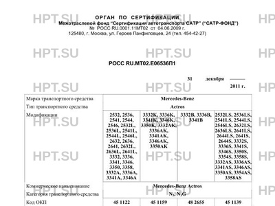 | Коммерческое наименование | Actros (2532, 2536, 2541, 2544, 2546, 2532L, 2536L, 2541L, 2544L, 2546L, 2632, 2636, 2641, 2632L, 2636L, 2641L, 3332, 3336, 3341, 3346, 3350, 3358, 3332A, 3336A, 3341A, 3346A); (3332K, 3336K, 3341K, 3346K, 3350K, 3332AK, 3336AK, 3341AK, 3346AK, 3350AK); (3332B, 3336B, 3341B); (2532LS, 2536LS, 2541LS, 2544LS, 2546LS, 2632LS, 2636LS, 2641LS, 2644LS, 2641S, 2644S, 3332S, 3336S, 3341S, 3346S, 3350S, 3354S, 3358S, 3332AS, 3336AS, 3341AS, 3346AS, 3350AS, 3354AS, 3358AS) Mercedes-Benz Actros |