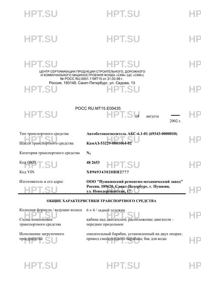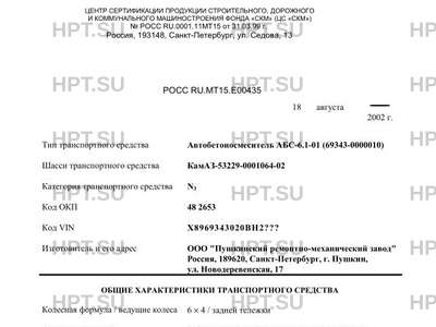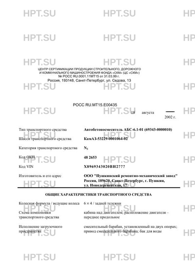 | Тип ТС | Автобетоносмеситель АБС-6.1-01 (69343-0000010) на шасси КамАЗ-53229-0001064-02 |