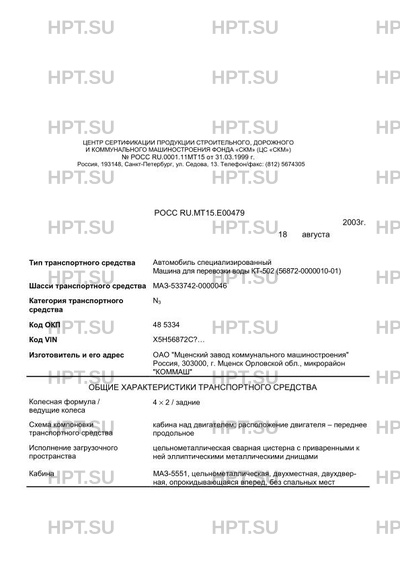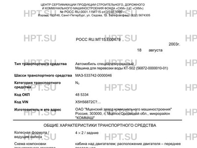 | Коммерческое наименование | Машина для перевозки воды КТ-502 (56872-0000010-01) на шасси МАЗ-533742-0000046 |