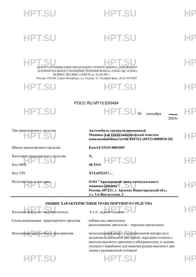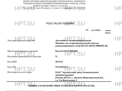 | Коммерческое наименование | Машина для гидродинамической очистки канализационных сетей КО-512 (69323-0000010-20) на шасси КамАЗ-53215-0001069 |