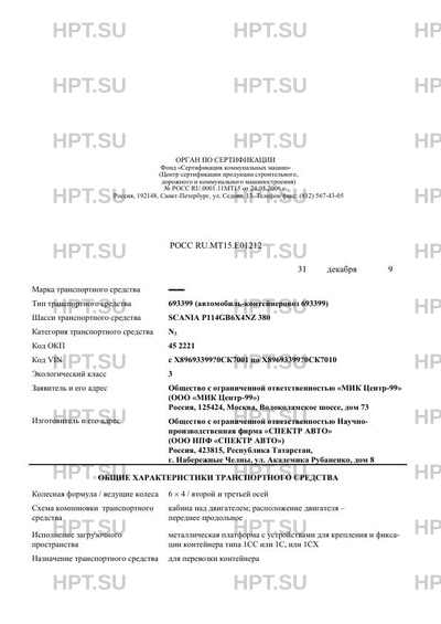 | Базовое ТС / Шасси | SCANIA Р114GB6Х4NZ 380 |