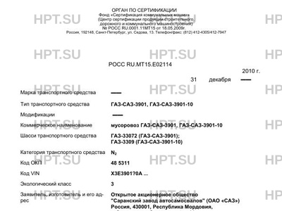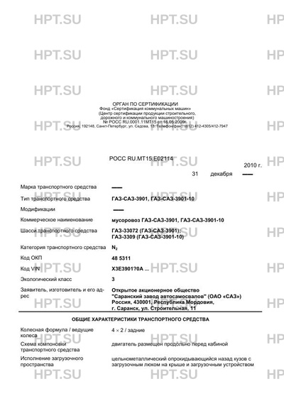| Коммерческое наименование | мусоровоз ГАЗ-САЗ-3901, ГАЗ-САЗ-3901-10 |