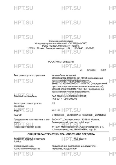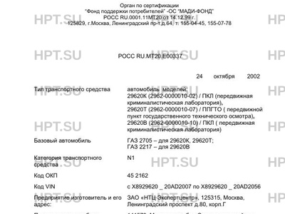 | Тип ТС | автомобиль моделей: 29620К (2962-0000010-02) / ПКЛ (передвижная криминалистическая лаборатория), 29620T (2962-0000010-07) / ППГТО (передвижной пункт государственного технического осмотра), 29620В (2962-0000010-10) / ПКЛ (передвижная криминалистическая лаборатория) |