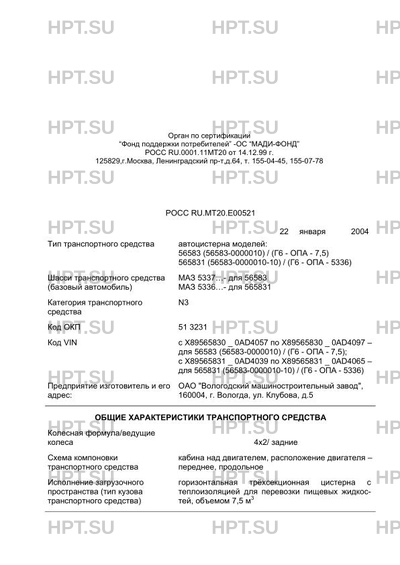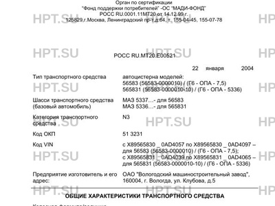 | Тип ТС | автоцистерна моделей: 56583 (56583-0000010) / (Г6 - ОПА - 7,5) 565831 (56583-0000010-10) / (Г6 - ОПА - 5336) |