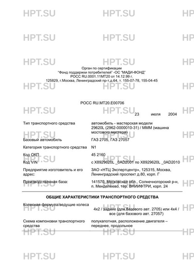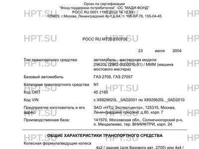 | Тип ТС | автомобиль - мастерская модели 29620L (2962-0000010-31) / МММ (машина мостового мастера) |