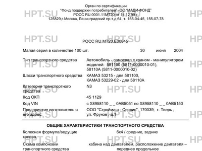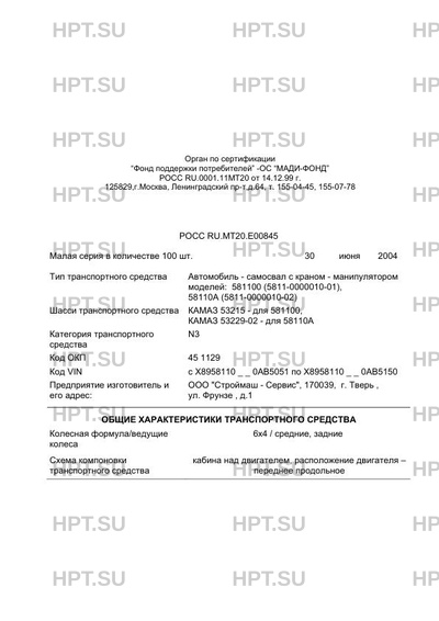 | Тип ТС | Автомобиль - самосвал с краном - манипулятором моделей: 581100 (5811-0000010-01), 58110А (5811-0000010-02) |