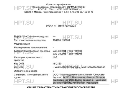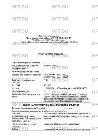 Заявитель ООО "Производственная компания "СпецАвтоФургон", 142131, Московская область, Подольский район, п. Остафьево, ремонтно - механические мастерские, Российская Федерация