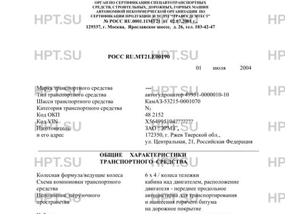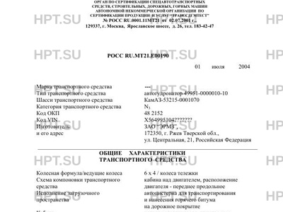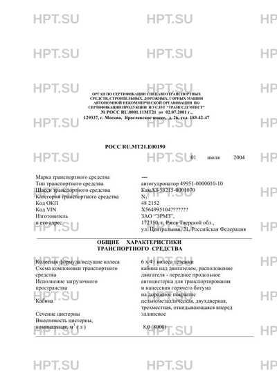 | Оборудование ТС | предпусковой подогреватель двигателя, транспортного средства коробка отбора мощности, держатель запасного колеса, буксирный прибор, знак ограничения скорости "60 км/ч" __________________________________________________________________________ Данное "Одобрение типа транспортного средства" распостраняется на партию автогудронаторов 49951-0000010-10 в количестве пятидесяти штук с производственными номерами с 0000001 по 0000050. автогудронатор 49951-0000010-10 |