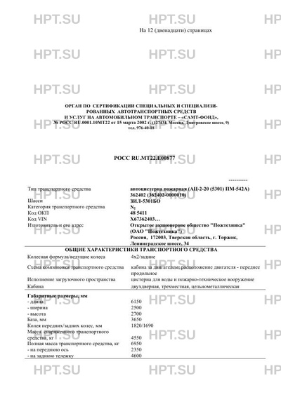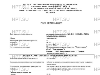 | Коммерческое наименование | автоцистерна пожарная (АЦ-2-20 (5301) ПМ-542А) 362402 (362402-0000010) на шасси ЗИЛ-5301 |