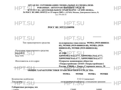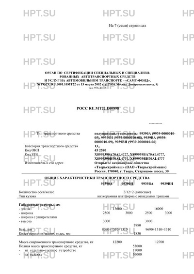 | Тип ТС | Полуприцепы-тяжеловозы: 99390А (9939-0000010-05),99390Н (9939-0000010-08), 9939ВА (9939-0000010-09), 9939ВН (9939-0000010-06) |
