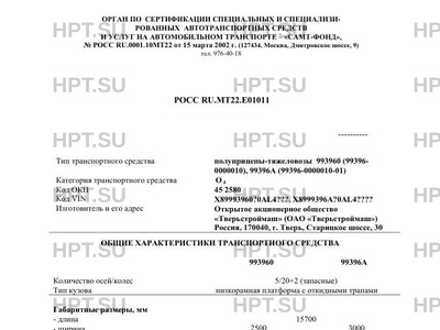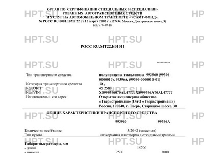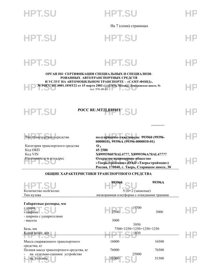 | Тип ТС | полуприцепы-тяжеловозы 993960 (99396- 0000010), 99396А (99396-0000010-01) |