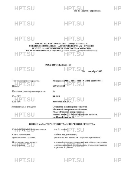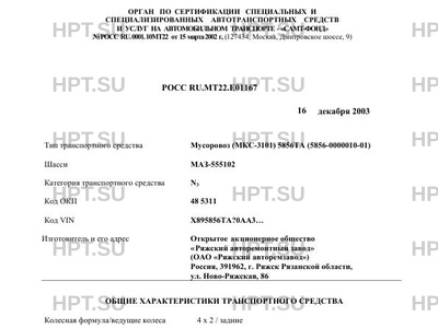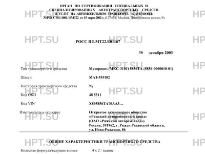 | Тип ТС | Мусоровоз (МКС-3101) 5856ТА (5856-0000010-01) на шасси МАЗ-555102 |