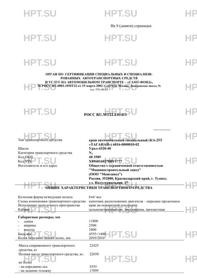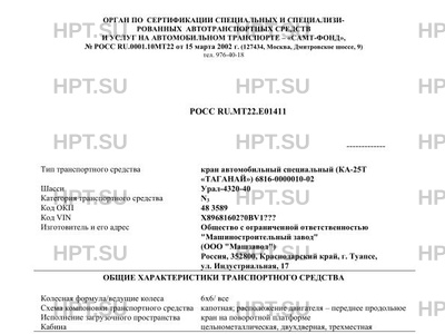 | Тип ТС | Кран автомобильный специальный (КА-25Т "Таганай") 6816-0000010-02 на шасси Урал-4320-40 |