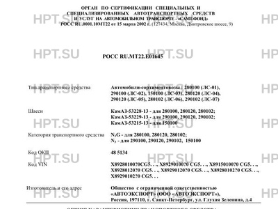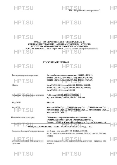 | Тип ТС | Автомобили-сортиментовозы: 280100 (ЛС-01), 290100 (ЛС-02), 150100 (ЛС-03), 280120 (ЛС-04), 290120 (ЛС-05), 280102 (ЛС-06), 290102 (ЛС-07) на шасси КАМАЗ-53228-13, КАМАЗ-53229-13, КАМАЗ-53215-13 |