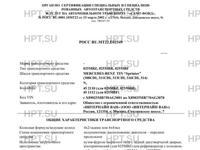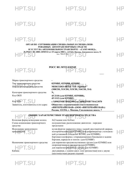 | Коммерческое наименование | Автомобиль бортовой 025MBF, автомобиль-фургон изотермический 025MBZ, автомобиль-рефрежиратор 025MBR на шасси MERCEDES-BENZ TIN “Sprinter” (308CDI, 311CDI, 313CDI, 316CDI, 314) |