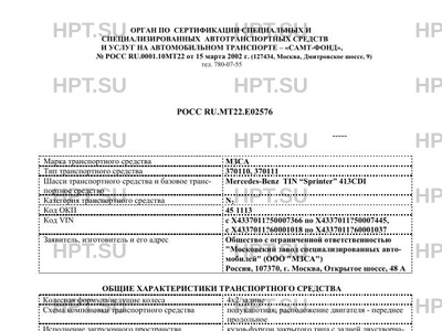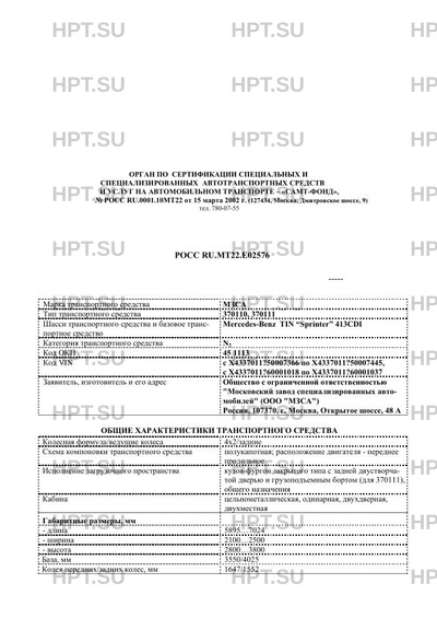 | Тип ТС | Автомобили-фургоны МЗСА-370110, МЗСА-370111 на шасси Мersedes-Benz TIN "Sprinter" 413CDI |