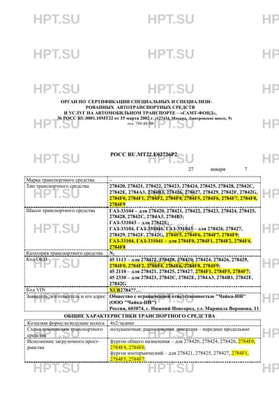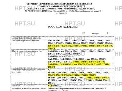 | Тип ТС | Автомобили 278420, 278421, 278422, 278423, 278424, 278425, 278428, 27842С, 27842Е, 2784А3, 2784В3, 278426, 278427, 278429, 27842F, 27842G, 2784F0, 2784F1, 2784F2, 2784F4, 2784F5, 2784F6, 2784F7, 2784F8, 2784F9 на шасси ГАЗ-33104 – для 278420, 278421, 278422, 278423, 278424, 278425, 278428, 27842С, 2784А3, 2784В3; ГАЗ-331043 – для 27842Е; ГАЗ-33104, ГАЗ-331041, ГАЗ-331043 – для 278426, 278427, 278429, 27842F, 27842G, 2784F5, 2784F6, 2784F7, 2784F9; ГАЗ-33104, ГАЗ-331041 – для 2784F0, 2784F1, 2784F2, 2784F4, 2784F8 |
