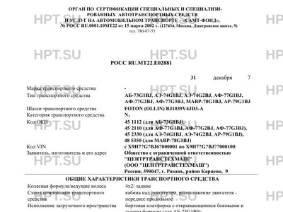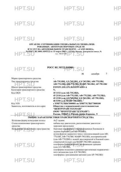 | Тип ТС | Автомобиль бортовой АБ-73G1BJ; автомобили-фургоны АФ-77G1BJ, АФ-77G2BJ, АФ-77G3BJ; автомобили специальные (эвакуаторы) АЭ-74G1BJ, АЭ-74G2BJ; машина аварийно-ремонтная МАВР-78G1BJ; автомобиль специальный (рекламный) АР-79G1BJ на шасси FOTON (OLLIN) BJ1039V4JD3-A |