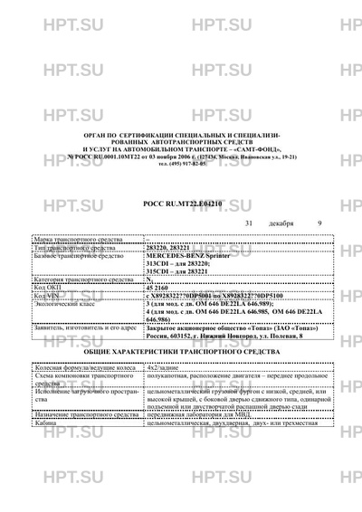 | Тип ТС | 283220, 283221 на шасси MERCEDES-BENZ Sprinter: 313CDI – для 283220; 315CDI – для 283221 |