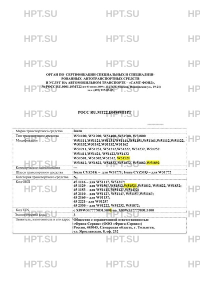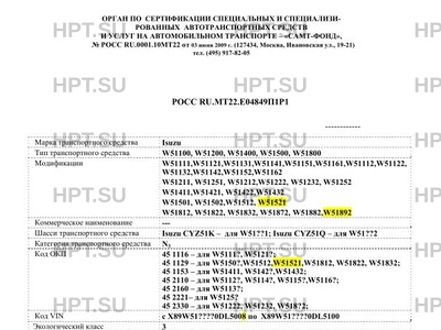 | Тип ТС | W51100, W51200, W51400, W51500, W51800 на шасси Isuzu CYZ51K – для W51??1; Isuzu CYZ51Q – для W51??2 |