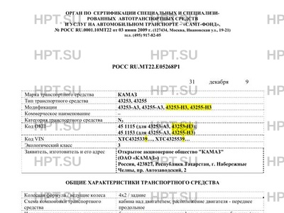 | Оборудование ТС | подогреватель двигателя; коробка отбора мощности (для 43255-А3, 43255-Н3) 4 |
