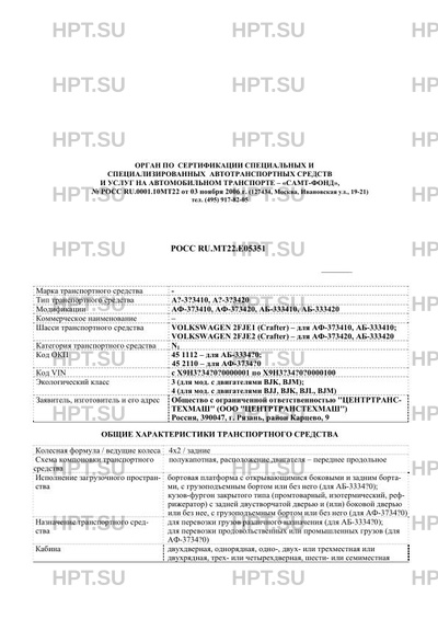 | Тип ТС | АФ-373410, АФ-373420, АБ-333410, АБ-333420 на шасси VOLKSWAGEN 2FJE1 (Crafter) – для АФ-373410, АБ-333410; VOLKSWAGEN 2FJE2 (Crafter) – для АФ-373420, АБ-333420 |